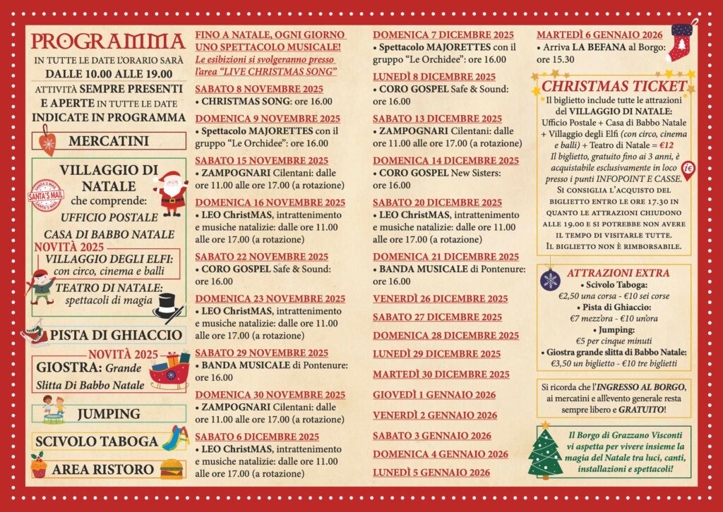 Le casette di legno come scrigni di colori, profumi e sapori da scoprire, un percorso incantato tra luci e musica, spettacoli ed attrazioni, riaccenderanno il cuore di Grazzano Visconti, che da metà novembre, tutti i week-end, e poi tutti i giorni dal 26 dicembre al 6 gennaio 2026 (escluso il 31 dicembre), vedrà le strade del borgo medievale trasformarsi in un magico Villaggio di Natale. Una passeggiata che oltre all’atteso mercatino di Natale, si trasformerà in una esperienza immersiva grazie alla novità 2025: il villaggio degli Elfi. È questa l’attrazione che promette emozioni indimenticabili, con il laboratorio per la stesura della lettera dei desideri, l’ufficio postale dove imbucare e spedire la missiva a Babbo Natale, che incontrerà i bambini all’interno della sua casetta. E ancora il teatro e il cinema degli elfi, la neve che si fa bolle di sapone, il gigantesco leadwall che proietta la storia di Rudolf la renna, una coreografia tutta da imparare e il circo degli elfi.