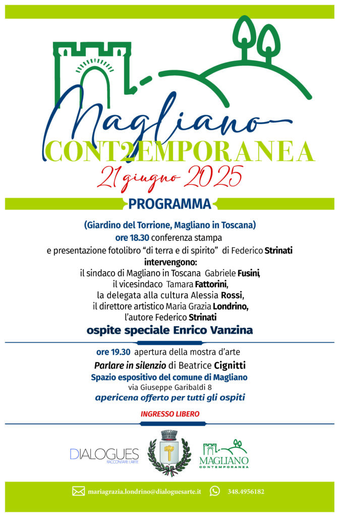 Ha preso ufficialmente il via sabato 21 giugno, con una conferenza partecipata da istituzioni, artisti e pubblico, la prima edizione di Magliano Contemporanea, rassegna d’arte visiva ideata da Maria Grazia Londrino, organizzata da Dialogues Arte e sostenuta dal Comune di Magliano in Toscana. L’iniziativa nasce come progetto curatoriale di respiro, capace di attivare nuovi sguardi sul territorio, attraverso l’arte come esperienza viva e stratificata. Un’operazione che mette in relazione paesaggio e visione, storia e sperimentazione, con l’ambizione di trasformare Magliano in Toscana in un nuovo polo culturale per le arti visive nel cuore della Maremma. Il progetto, pensato per connettere l’arte contemporanea al paesaggio, alla memoria e alla vocazione culturale della Maremma, si svolgerà fino al 6 settembre 2025 e prevede tre mostre personali, un fotolibro d’autore dedicato al territorio e l’assegnazione del Premio Tavano-Amodeo, riconoscimento rivolto a un artista contemporaneo.