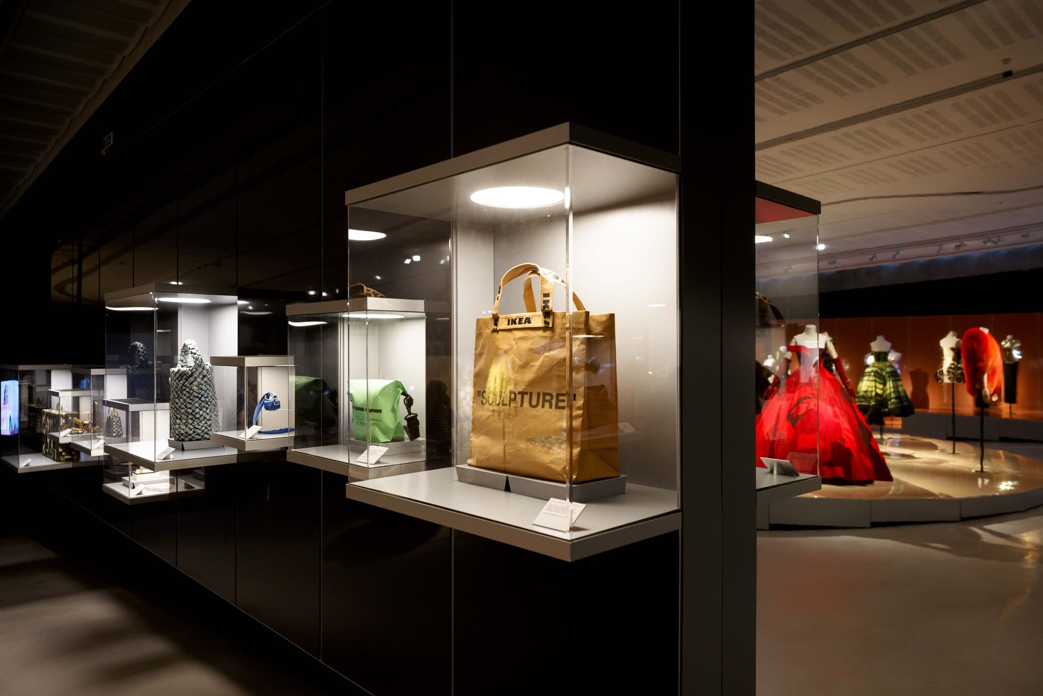 La mostra propone una serie di “stazioni” in cui gli abiti costruiscono relazioni inaspettate fra loro, dove i pezzi straordinari della haute couture dialogano con esperienze più indipendenti, senza gerarchie. Memorabile. Ipermoda è l’occasione per poter ammirare i virtuosismi di Viktor&Rolf, protagonisti dell’immagine guida della mostra, insieme alla couture di Christian Dior nell’interpretazione di Maria Grazia Chiuri e a quella inaspettata di Schiaparelli secondo Daniel Roseberry, e di Balenciaga secondo il progetto di Demna Gvasalia; le esplorazioni concettuali di Jonathan Anderson e quelle politiche di Virgil Abloh per Louis Vuitton; le visioni del maschile secondo Thom Browne e Craig Green; la grande stagione contemporanea della moda italiana, dai protagonisti più affermati come Giorgio Armani, Miuccia Prada (che ora condivide la direzione creativa del suo marchio con Raf Simons) e Dolce&Gabbana (che riattivano l’archivio collaborando con Kim Kardashian), fino alle esperienze più recenti, da Alessandro Michele nella sua interpretazione di Valentino, passando per Marni secondo Francesco Risso, fino alla nuova generazione di designer rappresentata da ACT N°1 e Marco Rambaldi. Alcuni oggetti ritmano il percorso espositivo, sottolineando le atmosfere della mostra: in particolare, lo straordinario carapace in bronzo e ottone decorato con monete d’argento e gemme realizzato da Bvlgari su ideazione dell’artista Francesco Vezzoli è un oggetto spettacolare e monumentale, che ci fa riflettere sull’oscillazione sempre attuale del gusto fra massificazione e radicale individualismo.