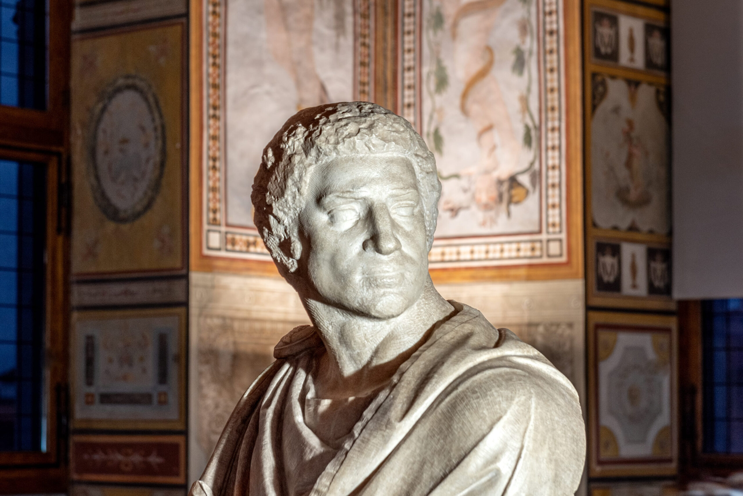 Di grande suggestione è la presentazione di una sorta di gipsoteca dedicata a Michelangelo, con calchi di alcune delle sue opere maggiori, legate tutte per varie ragioni ai rapporti dell’artista con i grandi dell’epoca: come il calco dell’Angelo reggicandelabro, eseguito a Bologna dove venne protetto dal nobile Francesco Aldrovandi, quello del Bacco commissionato all’artista dal cardinale Riario, nipote di Sisto IV, la riproduzione in gesso della Pietà Vaticana, realizzata a Roma peril cardinale Jean Bilhères De Lagraulas la copia monumentale della testa del David di Piazza Signoria, i due Schiavi (il Barbuto e il Morente), la Notte delle Cappelle Medicee, una delle sculture scolpite per celebrare i duchi Medici, Lorenzo e Giuliano. Tra queste testimonianze indirette anche una riproduzione semprein gesso del Busto di Michelangelo, eseguita a partire dall’originale di Daniela da Volterra.
