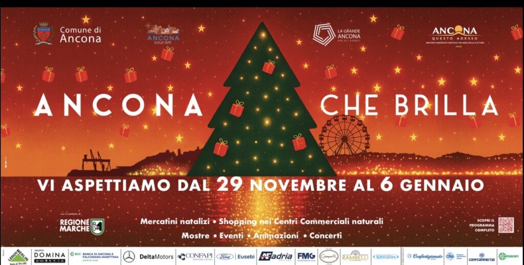 “Ancona che brilla 2025” accende il Natale ad Ancona. Da sabato 29 novembre la città è in pieno clima natalizio con l’accensione delle luminarie e dell’albero in Piazza Roma e il coinvolgimento di diversi spazi della città per quel “Natale diffuso” che dal 2023 caratterizza il cartellone e il clima del periodo delle feste.