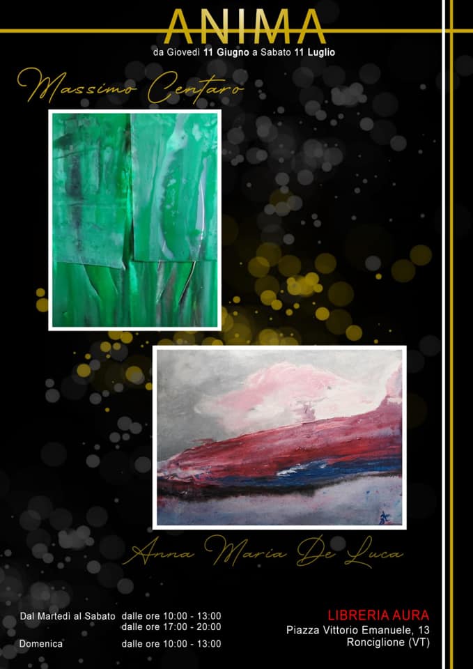 Con “Anima”, Stefano Cianti, pittore e performer, inaugura l’11 giugno presso lo spazio espositivo “Libreria Aura” il suo progetto “Un Attimo d’ Arte”: due anni di iniziative culturali e mostre (sulla pagina Facebook “Spazio Un Attimo d’ Arte”). Cianti ha scelto di aprire con la mostra degli artisti Anna Maria De Luca e Massimo Centaro, diversi nelle tecniche e nelle storie ma accomunati dalla passione di dipingere l’invisibile.