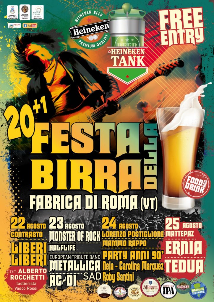 Ad accompagnare la protagonista “luppolo made” anche una serie di menu rapidi e diversificati, ma soprattutto una musica coinvolgente adatta ad ogni generazione che vedrà aprire i concerti di giovedì, venerdi e sabato con dei gruppi di ragazzi del luogo per far conoscere anche la produzione musicale del territorio fabrichese. Si inaugura il 22 agosto con “Liberi Liberi”, la cover band di Vasco Rossi con Alberto Rocchetti, tastierista di Vasco; venerdi 23 sarà la volta della tribute band europea dei Metallica e degli ACDC “Monsters of Rock”; sabato 24 Lorenzo Postiglione si esibirà col rapper viterbese Mammo Rappo, prima di cedere la scena ai dj Roby Santini, Neja e Carolina Marquez per una festa in stile anni Novanta. Infine, domenica 25 agosto, gran finale con Ernie e Tedua, anticipati da Mattepaz.