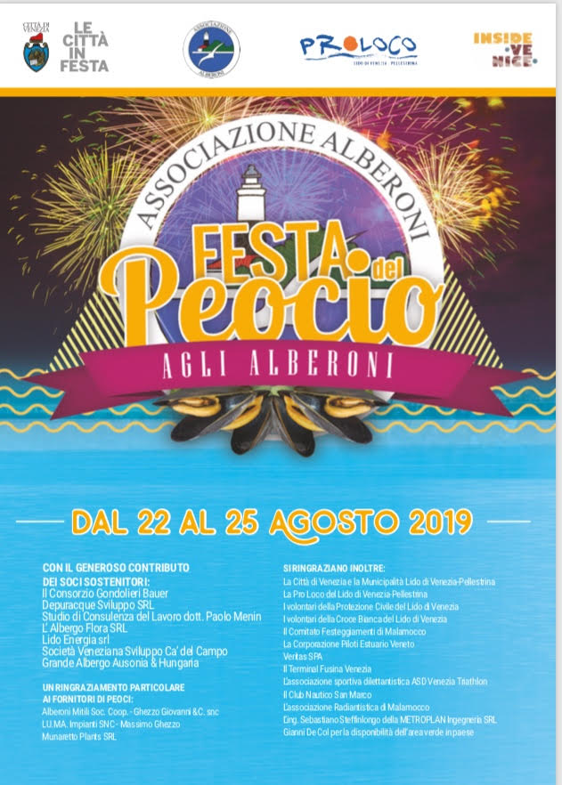 Associazione Alberoni presenta l’edizione 2019 della Festa del Peocio. Da giovedì 22 a domenica 25 al Lido degli Alberoni di Venezia una grande festa con eventi e stand enogastronomici. Durante il weekend troverete un torneo di calcio non competitivo per grandi e ragazzi presso il campo da calcio degli Alberoni nel pomeriggio di giovedì 22 e venerdì 23 agosto. Nella giornata di sabato 24 la tradizionale corsa non competitiva di 10 km AlbeRUNadaAlbeRUNada”, giunta alla sua terza edizione. Domenica 25 una regata con successive premiazioni. Tutti i giorni vi aspetta poi un mercatino di prodotti artigianali locali.