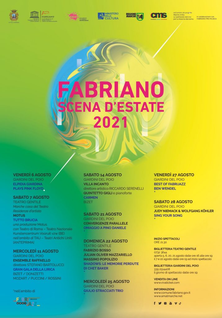 Un ricco cartellone di musica e teatro per Fabriano Scena d’Estate, nove appuntamenti al Teatro Gentile e ai Giardini del Poio per la rassegna in programma dal 6 al 28 agosto, promossa dal Comune di Fabriano con AMAT, Regione Marche, MiC, Consorzio Marche Spettacolo nell’ambito del progetto Marche in Vita. Lo spettacolo dal vivo per la rinascita dal sisma e in collaborazione con Fabriano Pro Musica per FabriJazz.