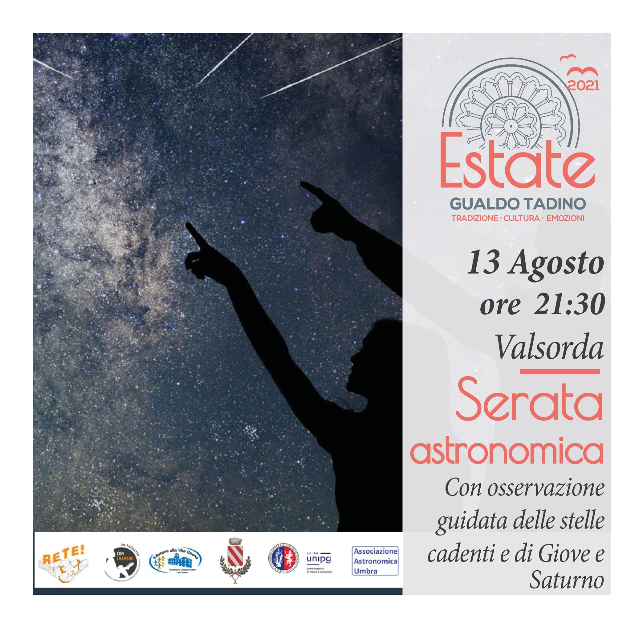 La serata rivolta a bambini e ragazzi dai 6 ai 12 anni ed alle loro famiglie, è organizzata dall’Associazione Educare alla Vita Buona, in collaborazione con il Comune di Gualdo Tadino, l’Associazione Astronomica dell’Umbria ed il Dipartimento di Fisica e Geologia di UniPg nell’ambito del progetto RETE! sostenuto dall’impresa sociale con i Bambini.