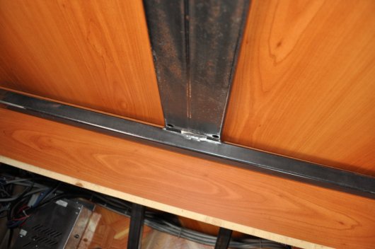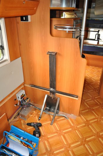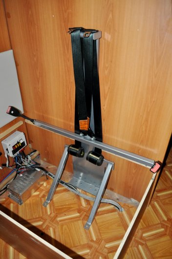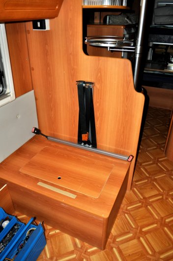 1) smonto la cassapanca e verifico dove e come posso fissare la struttura che, scopiazzata da quelle originali, avrà una forma a croce: la parte bassa fissata, attraverso il pavimento, al telaio; i due bracci laterali ai quali fissare i pulsanti di sgancio delle cinture; il montante centrale dove scorrono i due nastri grazie agli arrotolatori messi nella parte che rimarrà dentro la panca.
