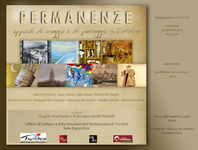 Mercoledì 23 ottobre 2013, alle 18.00, presso lo spazio espositivo dell’Ufficio Cultura e Informazioni dell’Ambasciata di Turchia a Roma in Piazza della Repubblica 55-56, si inaugurerà la mostra collettiva di pittura e scultura “Permanenze. Appunti di viaggio e di paesaggio in Turchia” a cura di Angelo Andriuolo e Francesco Giulio Farachi, in collaborazione con Ars Imago Dei, Lentarte, Radio Colonna. La mostra resterà aperta al pubblico fino al 22 novembre 2013 negli orari di apertura degli uffici.