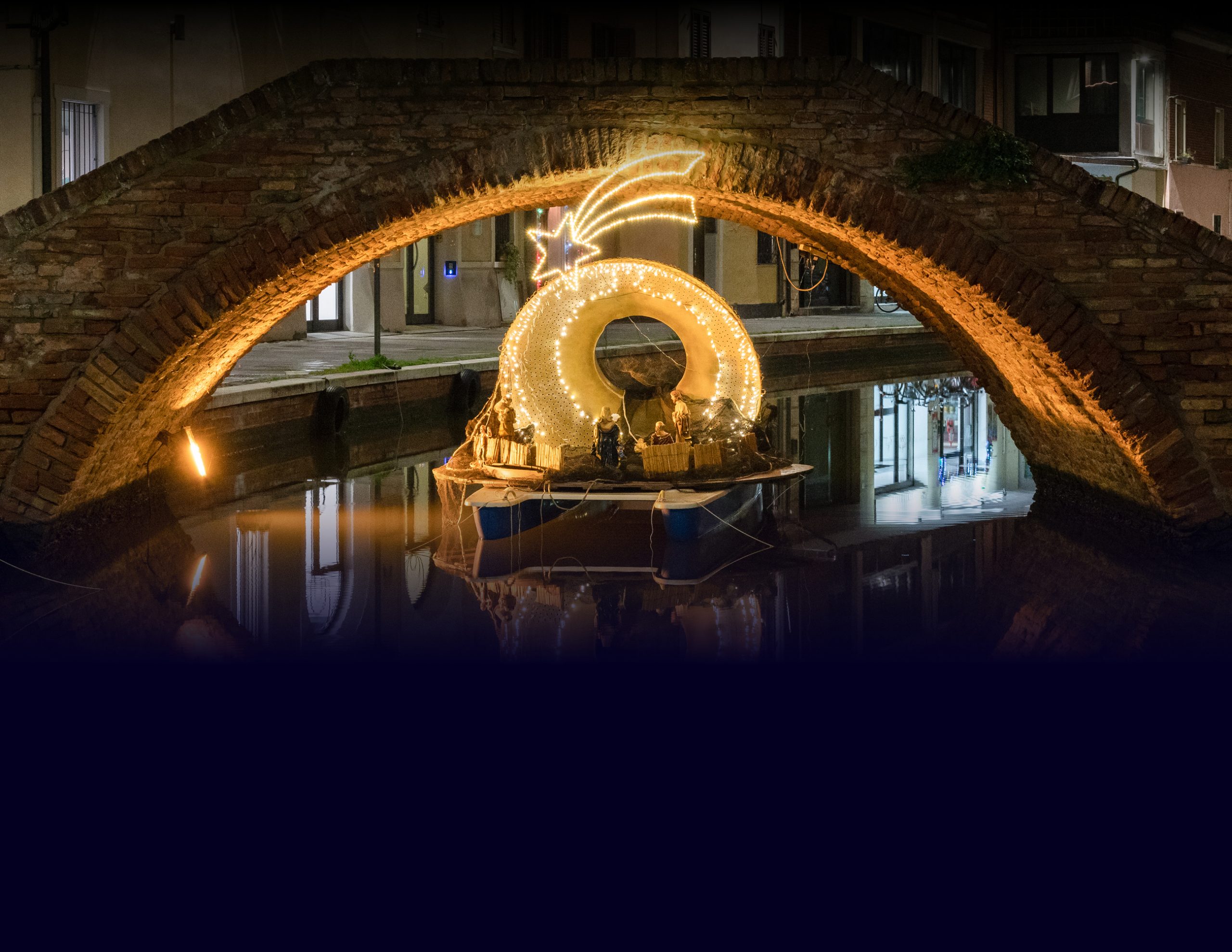 Alberi di luci che nascono sui canali, luci scenografiche sui Trepponti, presepi artistici sotto i ponti del centro storico: Comacchio (FE) si presenta così, sfavillante e colorata per accogliere e esprimere, come in un abbraccio, gli auguri più belli per le festività.