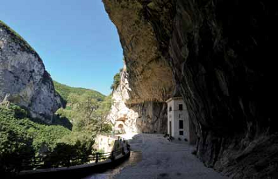 Imboccata la gola di Frasassi (siamo nel Parco regionale Gola della Rossa e di Frasassi), scavata dal Sentino, percorrendo un’affascinante strada tra alte pareti a strapiombo – con numerose grotte in cui sono state trovate tracce di insediamenti preistorici e nell’ampia grotta del Santuario sono state costruite la cappella di S. Maria intra Saxa e una piccola chiesa ortogonale con cupola per volere di Leone XII – si giunge alle famose grotte.