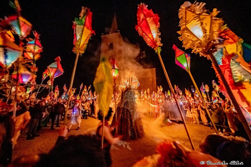 È così che partirà la storica sfilata, quasi una “processione” ma festante e scompigliata, che si snoderà in gran parte del paese al forte grido di “Fora fora li Moccule” ed al ritmo di percussioni, e concluderà la sua marcia in Piazza San Pietro, punto più alto del vecchio incasato. Qui i Moccoli, dopo un’antica liturgia recitata e la battaglia finale (un po’ come a Roma, 250 anni fa, la gara a spegnere il moccolo altrui…) saranno bruciati in un gran falò, saltato come rito propiziatorio dai più giovani.