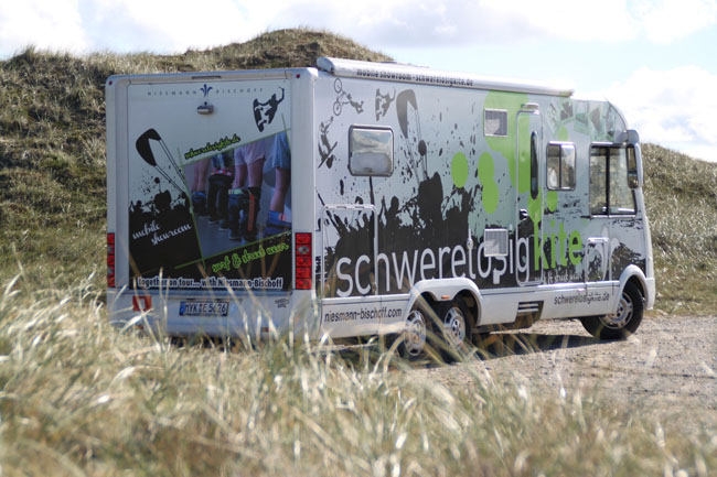 Si riconosce subito. Come il giglio rende l’esclusivo autocaravan inconfondibile, così caratteristico è una toppa kite cucita sulla sopra indicata griff. Niesmann+Bischof e “Schwerelosigkite” – due marchi, un corso comune e filosofie comparabili. Entrambe le aziende sono leader nel loro settore e rinforzeranno in futuro la loro collaborazione.