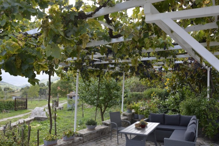 Spazi all’aperto: salottini relax ombreggiati da olivi e pergolato.