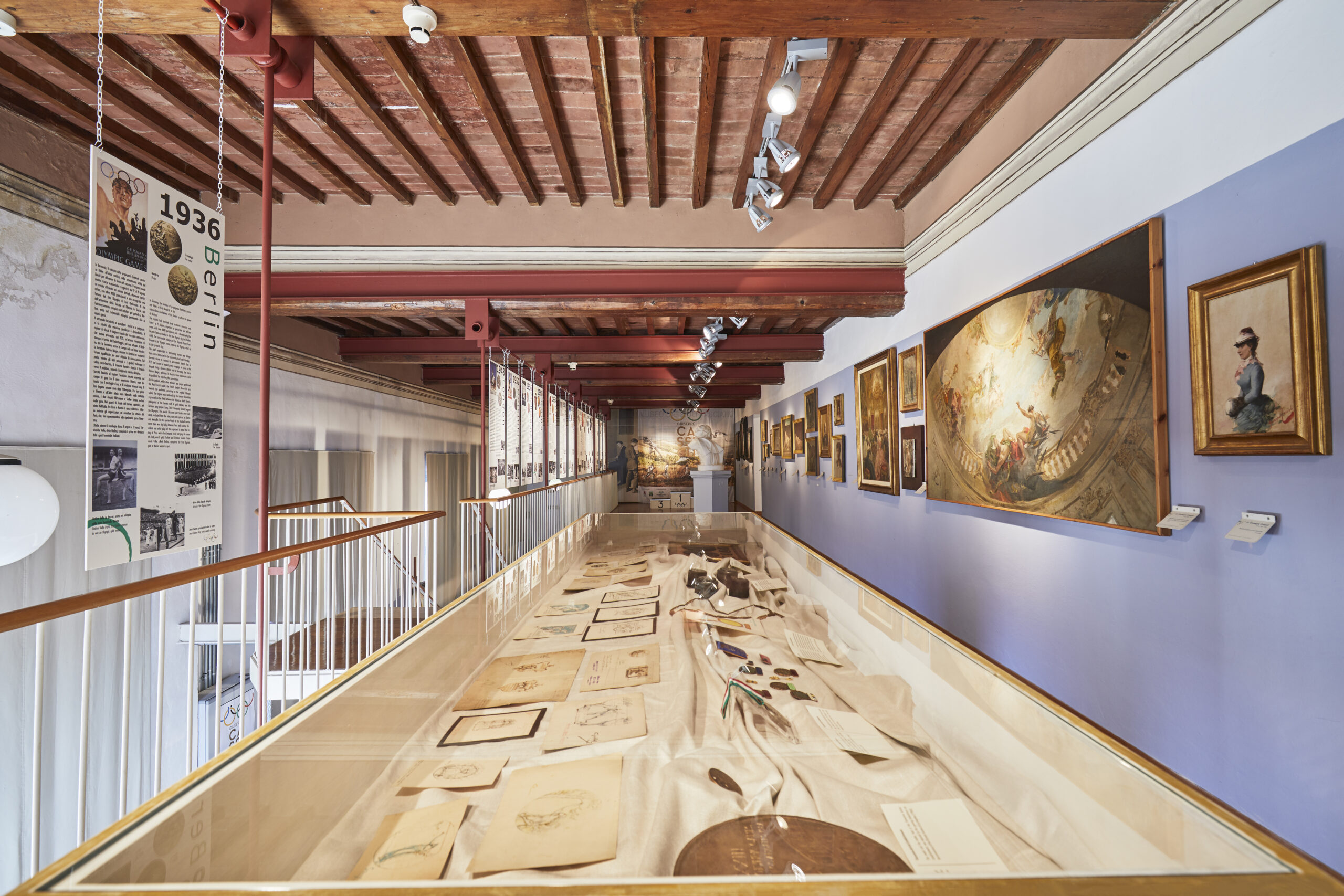 Il museo, ospitato in un palazzo storico nel centro del borgo, raccoglie le opere di Giuseppe Cassioli e di suo padre Amos, protagonisti della pittura italiana tra Ottocento e Novecento. Tra dipinti storici, ritratti e studi preparatori, emerge una pittura solida, narrativa, pensata per raccontare eventi e valori collettivi. È proprio questa capacità di tradurre ideali e gesti in immagini comprensibili e potenti che porta Giuseppe Cassioli a entrare nella storia dello sport. Nel 1928 gli viene affidata la realizzazione del manifesto ufficiale dei Giochi Olimpici di Amsterdam, un’immagine destinata a segnare una svolta. Quel manifesto non si limita a promuovere un evento sportivo: costruisce per la prima volta un’idea riconoscibile di Olimpiade, con l’atleta vincitore al centro della scena, lo stadio come spazio civico e la folla come comunità. Nasce così un linguaggio visivo che accompagnerà i Giochi per tutto il Novecento e oltre. Visitare oggi il Museo Cassioli significa comprendere come quell’immagine sia il frutto di una formazione culturale precisa, radicata nella tradizione figurativa italiana e nella centralità del corpo umano come misura, equilibrio e disciplina.