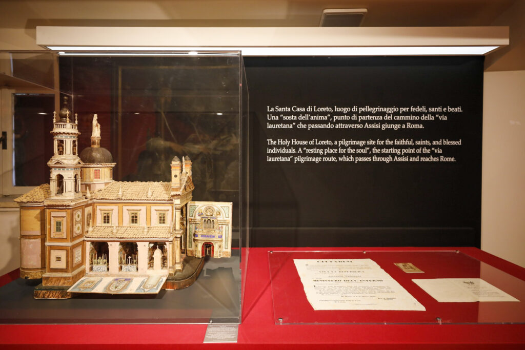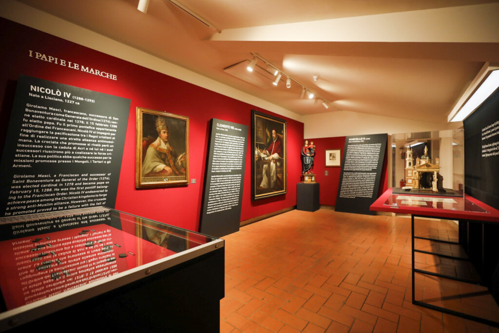 La mostra è divisa in 3 sezioni: nella prima il racconto dei papi attraverso biografie ed elementi che li contraddistinguono come ritratti, medaglie, oggetti legati alla loro committenza. Nella seconda i santi e i beati (San Marcellino, San Nicola da Tolentino, il Beato Sante, San Giacomo della Marca, Santa Camilla Battista da Varano, San Giuseppe da Copertino, Santa Veronica Giuliani, Santa Maria Goretti) attraverso incisioni, quadri, oggetti di culto e di valore spirituale.