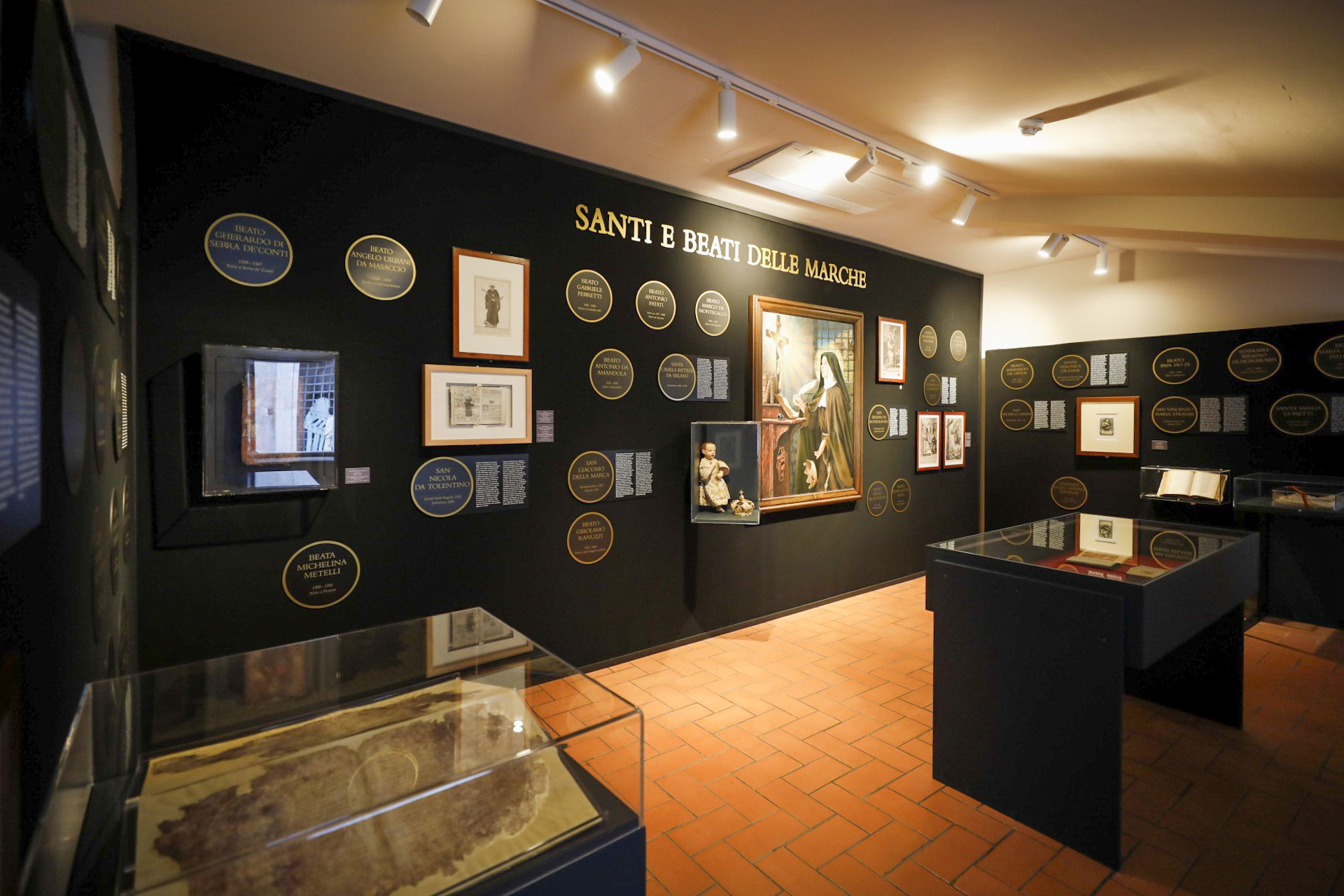 La mostra è divisa in 3 sezioni: nella prima il racconto dei papi attraverso biografie ed elementi che li contraddistinguono come ritratti, medaglie, oggetti legati alla loro committenza. Nella seconda i santi e i beati (San Marcellino, San Nicola da Tolentino, il Beato Sante, San Giacomo della Marca, Santa Camilla Battista da Varano, San Giuseppe da Copertino, Santa Veronica Giuliani, Santa Maria Goretti) attraverso incisioni, quadri, oggetti di culto e di valore spirituale.