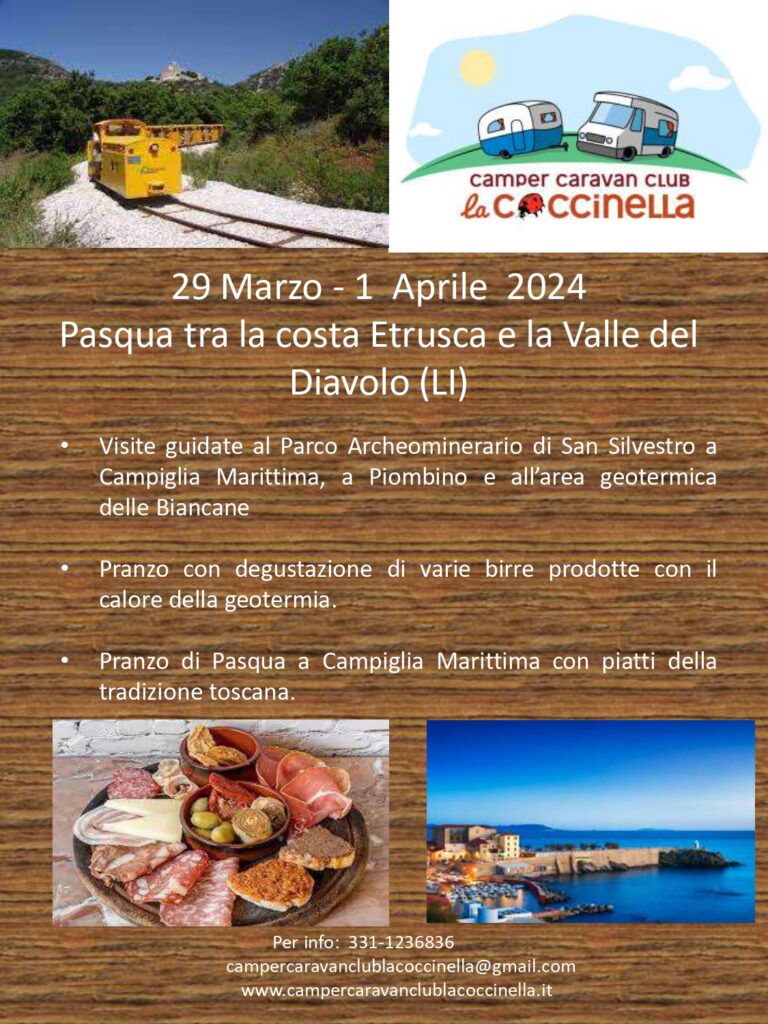 Il Campercaravanclub La Coccinella di Roma organizza un viaggio tra la Costa Etrusca e la Valle del Diavolo (LI) in occasione del weekend di Pasqua (29 marzo – 1 aprile 2024). Trovate di seguito il programma.