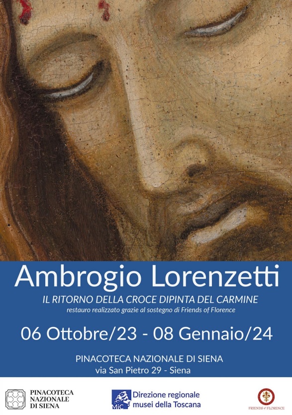 La grande Croce sagomata e dipinta a tempera e oro su tavola da Ambrogio Lorenzetti, databile al 1328-1330, fa parte della raccolta della Pinacoteca Nazionale di Siena (inv. 598). E’ stata oggetto di un complesso restauro, durato dal maggio 2020 al giugno 2023. L’intervento, condotto da Muriel Vervat e diretto da Stefano Casciu, è stato reso possibile grazie al contributo di Friends of Florence che ha accolto la proposta della Direzione regionale musei della Toscana, all’epoca competente per la Pinacoteca di Siena, divenuta poi autonoma nel 2022.