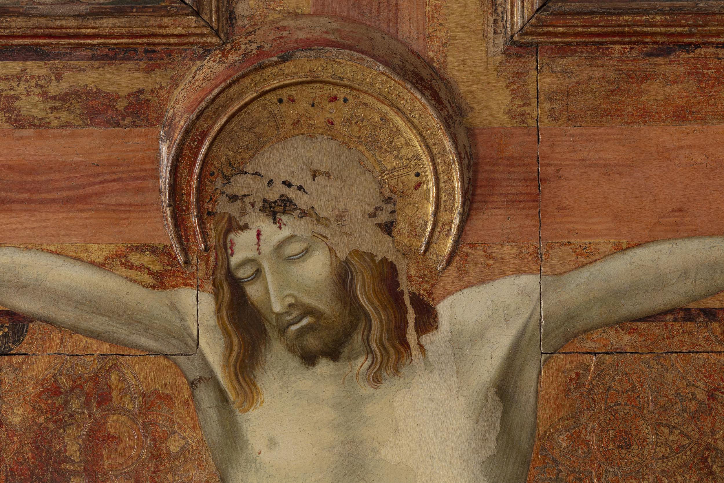 Il fondo dorato della croce, che imita un tessuto riccamente ornato, riveste un valore importante poiché presenta non solo una preziosa decorazione, ma anche una sofisticata riflessione da parte di Ambrogio sulla diffusione della luce. Questo valore è oggi meno evidente perché la luce elettrica permette di godere nitidamente di ogni dettaglio di un’opera, ma all’epoca di Lorenzetti, quando la Croce era esposta in chiesa, l’illuminazione era data solo dalla luce naturale che filtrava dalle finestre, modificandosi nell’intensità e nella direzione a seconda delle ore del giorno, e dalle fiamme delle candele. Queste fonti di luce davano alla materia pittorica una luminosità viva e mutevole che metteva in valore la plasticità dell’anatomia dipinta del corpo di Cristo, dove i punti di maggiore rilievo sono le spalle e le ginocchia.