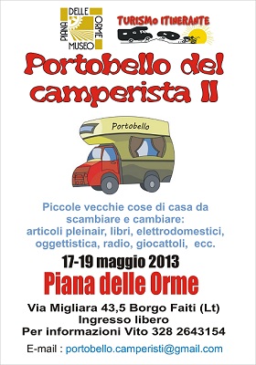 Il Museo Storico “Piana delle Orme” , “Turismo Itinerante” (gruppo editoriale Turit) con la collaborazione del Sig. Vito Bernardi, propongono dal 17 al 19 maggio 2013 il “Portobello dei Camperisti II”, piccole vecchie cose da scambiare e cambiare: articoli plein air, libri, elettrodomestici, oggettistica, radio, giocattoli, ecc.
