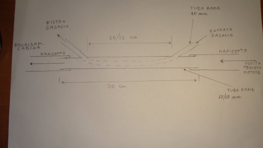 Nel tubo grande scorre acqua calda che esce dalla testata e va al riscaldamento cabina. Nel tubo piccolo scorre il gasolio che arriva dal serbatoio e va al filtro.