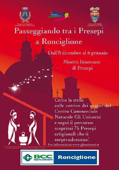 Passeggiando tra i presepi a Ronciglione è un’iniziativa del Centro Commerciale Naturale Gli Unicorni organizzata con il patrocinio dell’Assessorato al Turismo della Provincia di Viterbo e del Comune di Ronciglione e il contributo della Banca di Credito Cooperativo di Ronciglione.