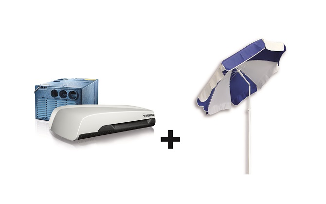 Cool comfort: acquistando un condizionatore Truma Aventa o Saphir, oltre al montaggio incluso, i camperisti riceveranno in omaggio uno splendido ombrellone da spiaggia in stile Truma. Insomma, come essere perfettamente attrezzati per l’estate: un bel posticino all’ombra in spiaggia e una temperatura piacevolmente fresca all’interno del veicolo.