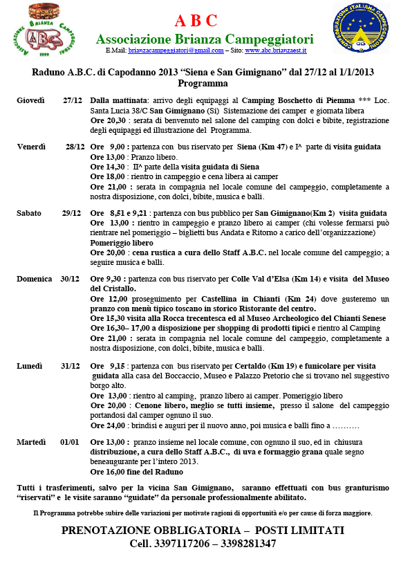 Il Raduno è a numero chiuso e con prenotazione obbligatoria; il programma è consultabile sul sito: www.abc.brianzaest.it . Per ulteriori informazioni e prenotazioni contattare i tel. 039/622479 – 039/653446 – 3397117206 – 3398281347 oppure brianzacampeggiatori@gmail.com “