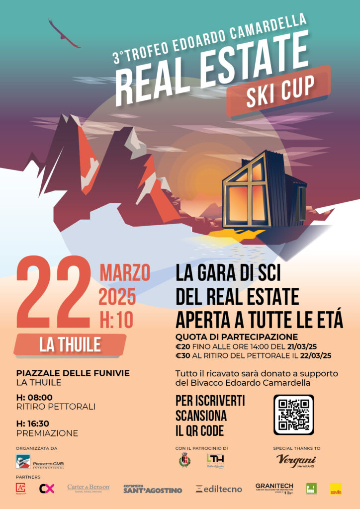 Sabato 22 marzo 2025 si terrà a La Thuile in Valle D’Aosta la terza edizione della Real Estate Ski Cup – Trofeo Edoardo Camardella, gara di sci organizzata da Progetto CMR International, in memoria di Edoardo Camardella, giovane maestro di sci travolto da una slavina il 30 novembre 2019 sul Monte Bianco.
