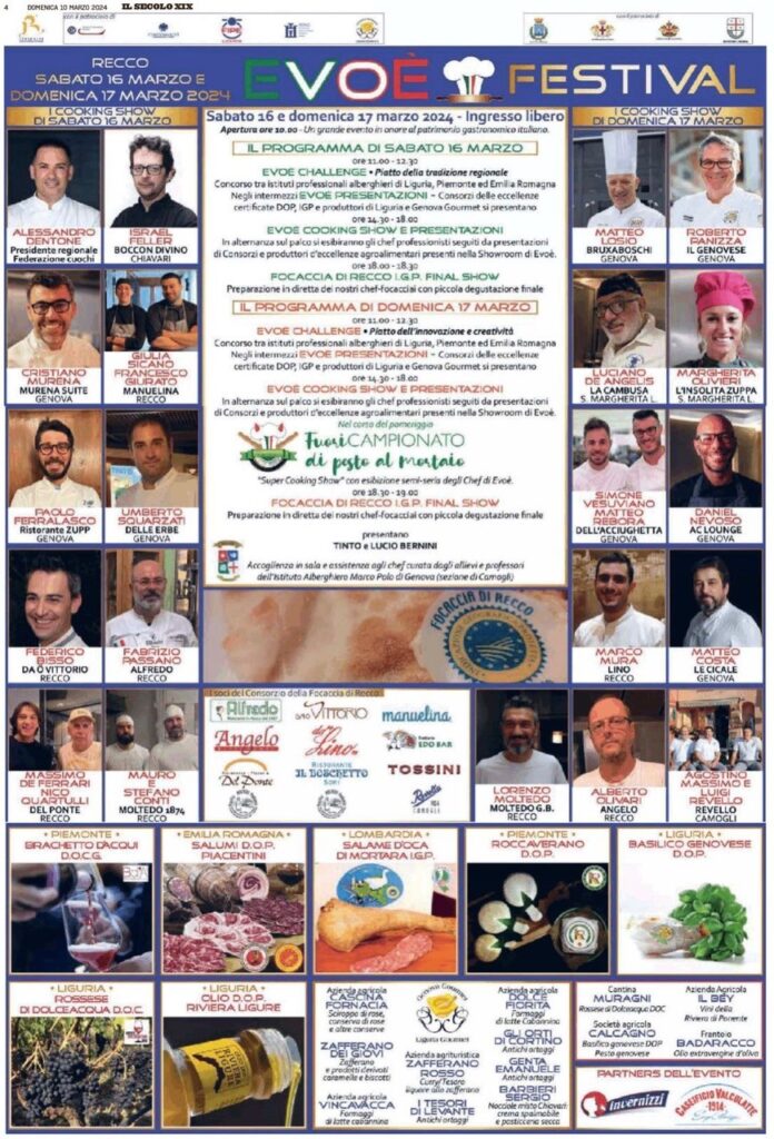 Il Consorzio della Focaccia di Recco col formaggio, che ha ottenuto nel 2015 il marchio di tutela comunitario I.G.P. per il prodotto di cui porta il nome, organizza la seconda edizione di un grande evento in onore al patrimonio gastronomico italiano: “Evoè”, il festival dell’arte gastronomica e dei prodotti d’eccellenza
