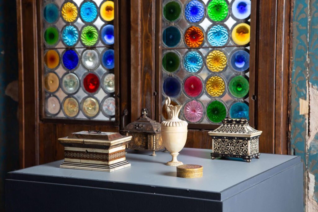 Il percorso espositivo si arricchisce di altri cofanetti preziosi e insoliti che ornano la Camera delle Meraviglie, come quello in legno e avorio con elementi decorativi vegetali e spiraliformi, probabilmente adoperato in ambito liturgico e databile alla metà del XVII secolo, rivestito all’interno con carta rossa decorata con motivi vegetali e animali impressi in oro. S’incontrano poi la piccola cassettina in ebano e osso caratterizzata da una singolare decorazione a marqueterie, tipica di una produzione artigiana sviluppatasi nella seconda metà del XIV secolo nell’area centroitaliana, in particolare toscana; il forzierino in rame rivestito di smalti blu e bianchi con raffinati ornamenti oro, che rientra nel novero di oggetti riferiti alla produzione veneziana quattro-cinquecentesca; l’affascinante coppa composta da una conchiglia innestata su un sostegno in rame dorato, con base circolare e profilo inciso ad acquaforte, ricondotta dalla critica alla cultura orafa del Cinquecento e dei primi anni del secolo successivo; la rarissima maschera da giustizia in acciaio brunito, modellata con i lineamenti di un uomo calvo di mezza età, composta da due parti congiunte prodotte nel nord Europa – verosimilmente in Germania o in Inghilterra – in epoche differenti, e poi assemblate in un unico manufatto nel XIX secolo; e il cappello maschile in pelle scamosciata di manifattura italiana, databile alla metà del Cinquecento.