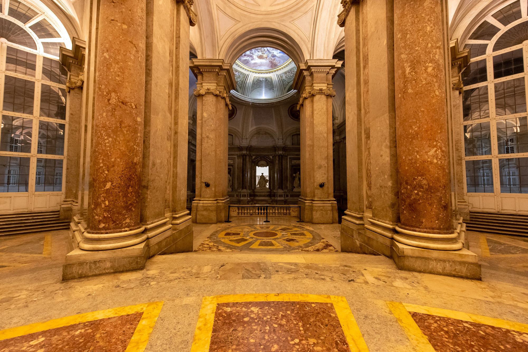 Il fascino degli spazi di Corte nell’atmosfera sognante della sera offre sempre suggestive atmosfere. Dopo aver percorso il Cannocchiale, la penombra dell’imponente Scalone Reale accompagnerà il pubblico al Piano nobile e al Vestibolo superiore. Da lì, dopo aver attraversato le anticamere degli Appartamenti Reali, all’interno delle quali è possibile ammirare le prime opere della collezione Terrae Motus esposte con il nuovo allestimento, “Terremoto in palazzo” di Joseph Beuys e “Terrae Motus” di Augusto Perez, il visitatore si troverà al centro della facciata principale del Palazzo, nella Sala di Alessandro che funge da punto di congiunzione tra l’ala dell’Ottocento e quella del Settecento.