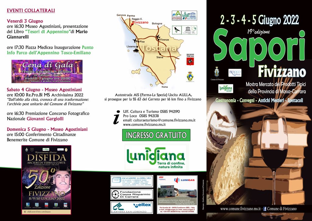 A Fivizzano (Massa-Carrara) nei giorni 2-3-4-5 giugno 2022 arriva “Sapori”. Si tratta della più importante manifestazione cultural-enogastronomica dei prodotti tipici della provincia di Massa-Carrara, oltre che dei prodotti del Parco Nazionale dell’Appennino Tosco-Emiliano, del Parco Nazionale delle Cinque Terre e del Parco Regionale delle Alpi Apuane con una particolare sezione dedicata agli antichi mestieri e all’artigianato.