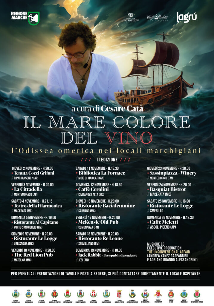 “Il mare colore del vino – ha spiegato Catà – è un verso omerico, così l’aedo descrive la distesa d’acqua tra i cui flutti ambienta il viaggio di Ulisse. All’interno di questo verso noi abbiamo intraveduto un elemento legato alla convivialità e alla necessità di condividere ‘il racconto’ nei luoghi deputati alla socialità. Immaginando le Marche quasi come un mare navigando il quale andremo a raccontare storie, alternando versi, suoni e significati, abbiamo voluto riperpetuare quella antica modalità di viaggiare per raccontare. Quale luogo migliore se non questa regione, forse tra tutte la più intrisa di poesia?”