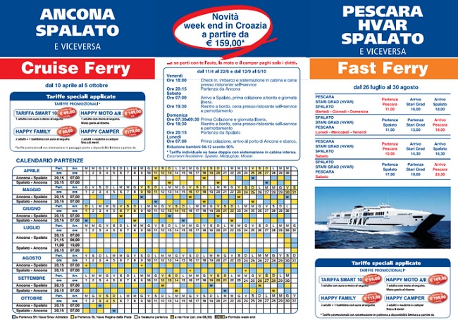 Inoltre da quest’anno, grazie ad un accordo commerciale tra le compagnie di navigazione Snav e Blue Line, sarà possibile partire da Ancona per Spalato e viceversa ogni giorno. Con un’unica prenotazione si potrà viaggiare sui traghetti di entrambe le Compagnie e si potrà scegliere di programmare la vacanza con più partenze disponibili.