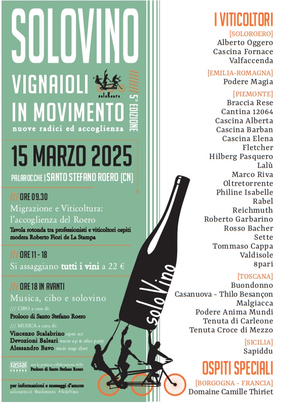 Sono 30 gli “artigiani del vino” provenienti da Piemonte, Toscana, Emilia Romagna e Sicilia, che il 15 marzo animeranno la quinta edizione della fiera-mercato SoloVino al Palarocche di Santo Stefano Roero (CN). Ospite speciale il Domaine Camille Thiriet dalla Borgogna francese. Organizzata dal collettivo SoloRoero, la manifestazione quest’anno propone il tema: “Vignaioli in movimento”, per esplorare il legame tra il vino e il concetto di migrazione, geografica, professionale, culturale.