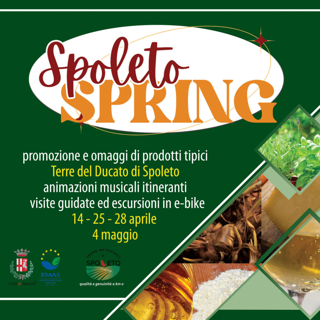 Dopo l’appuntamento di domenica 14 aprile continua Spoleto Spring, la promozione delle aziende agricole del territorio riunite nell’ATS ‘Terre del Ducato di Spoleto’ di cui il Comune di Spoleto è capofila, nell’ambito del progetto finanziato dal Gal Valle Umbra e Sibillini finanziato con il Programma di Sviluppo Rurale dell’Umbria 2014-2020. Spoleto Spring è una nuova iniziativa per promuovere i prodotti delle aziende dell’Ats inserita nel calendario di ‘Accade in Primavera a Spoleto’, il cartellone degli eventi organizzati dal Comune di Spoleto in collaborazione con le associazioni e le istituzioni della città.