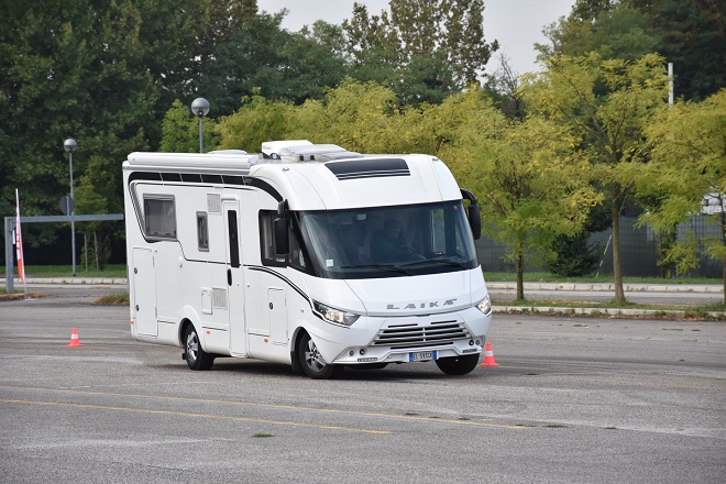 Sabato, tutti a scuola già dalla mattina presto, con una lezione teorica di guida sicura condotta da Luigi Vianello, ex responsabile della formazione di BMW Italia, e oggi specializzato in comunicazione tecnica. Una volta assimilati i concetti di assetto, stabilità, tenuta di strada, interventi in situazione limite, gli equipaggi si sono trasferiti in pista per mettere in pratica i suggerimenti appena ricevuti. Su un veicolo sono state montate delle “calze” speciali in Teflon che simulano la perdita di aderenza del mezzo in presenza di neve e i partecipanti, adeguatamente assistiti da due piloti professionisti, si sono esibiti in derapate e sbandate molto spettacolari. Un secondo veicolo, invece, è stato impiegato su un percorso a birilli, affrontato con diverse velocità. Un terzo mezzo, il Kreos 5009 con telaio AL-KO è stato invece impiegato per un test drive su strada per permettere di verificare di persona le doti di affidabilità, tenuta di strada e sicurezza che offre questo profilato Laika accoppiato al telaio AL-KO AMC.