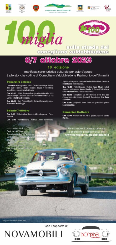 “Siamo sempre onorati di sostenere la Centomiglia, la corsa di auto storiche, che si dirama attraverso la prima arteria enologica italiana. Un’eccellenza nell’eccellenza!” dichiara la Presidente del Consorzio, Elvira Bortolomiol, che continua: “Il tracciato toccherà non solo i nostri vigneti, ma anche punti di rilievo storico-artistico che valorizzano il nostro intero territorio. La corsa sarà ancora più piacevole e ricca di sorprese alla scoperta della nostra comunità, dei nostri produttori che sono artefici di cultura profonda, tramandata da generazione a generazione, quella del Conegliano Valdobbiadene Prosecco Superiore DOCG.”