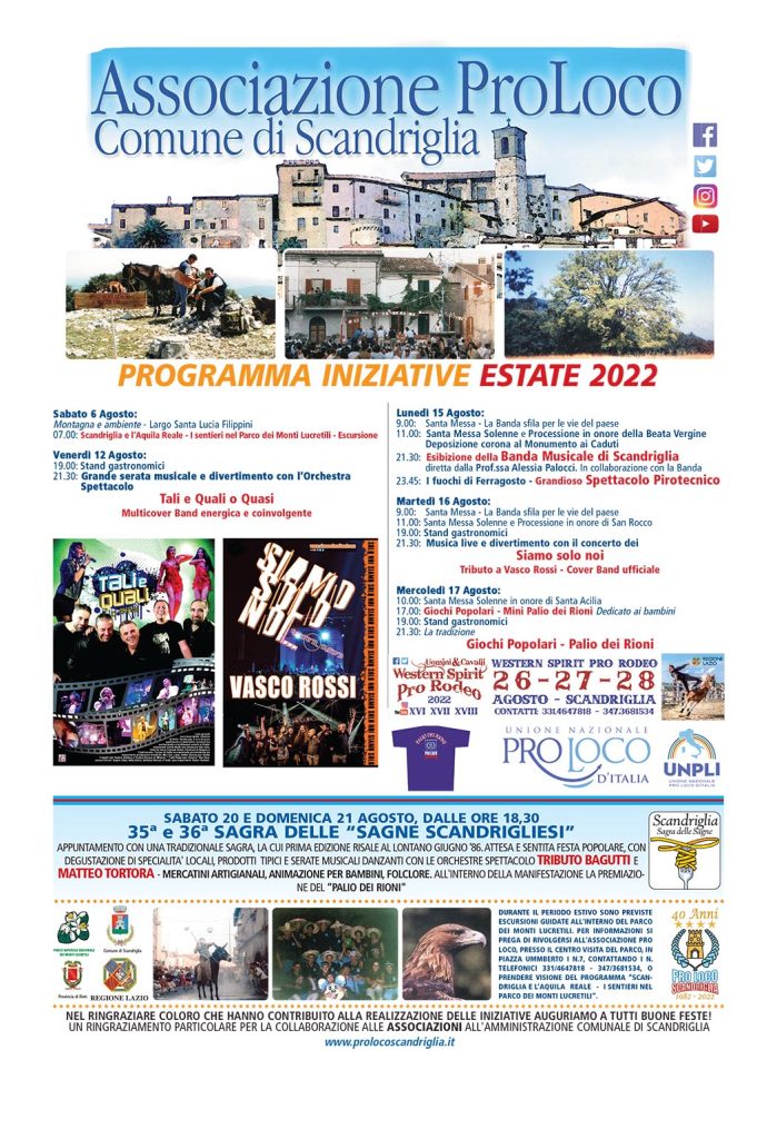 A partire da venerdì 12 agosto fino a fine mese la Pro Loco Scandriglia (Rieti) realizzerà diverse manifestazioni che comprendono tradizionalmente spettacoli, concerti, giochi, stand gastronomici ed iniziative varie.