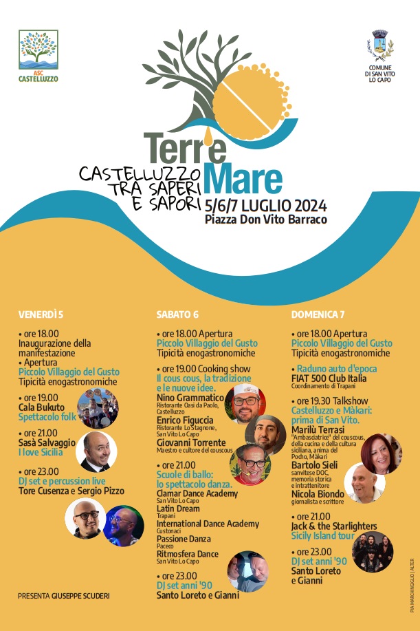Dal 5 al 7 luglio 2024, Piazza Don Vito Barraco a Castelluzzo ospiterà la prima edizione di “Terr’eMare – Castelluzzo tra saperi e sapori”, una rassegna culturale ed eno-gastronomica volta a promuovere e valorizzare il territorio di Castelluzzo che – insieme a Màkari, con la quale condivide paesaggi e suggestioni – offre un’atmosfera di pace e tranquillità ricercata dai turisti che scelgono di fermarsi qui, prima di San Vito lo Capo.