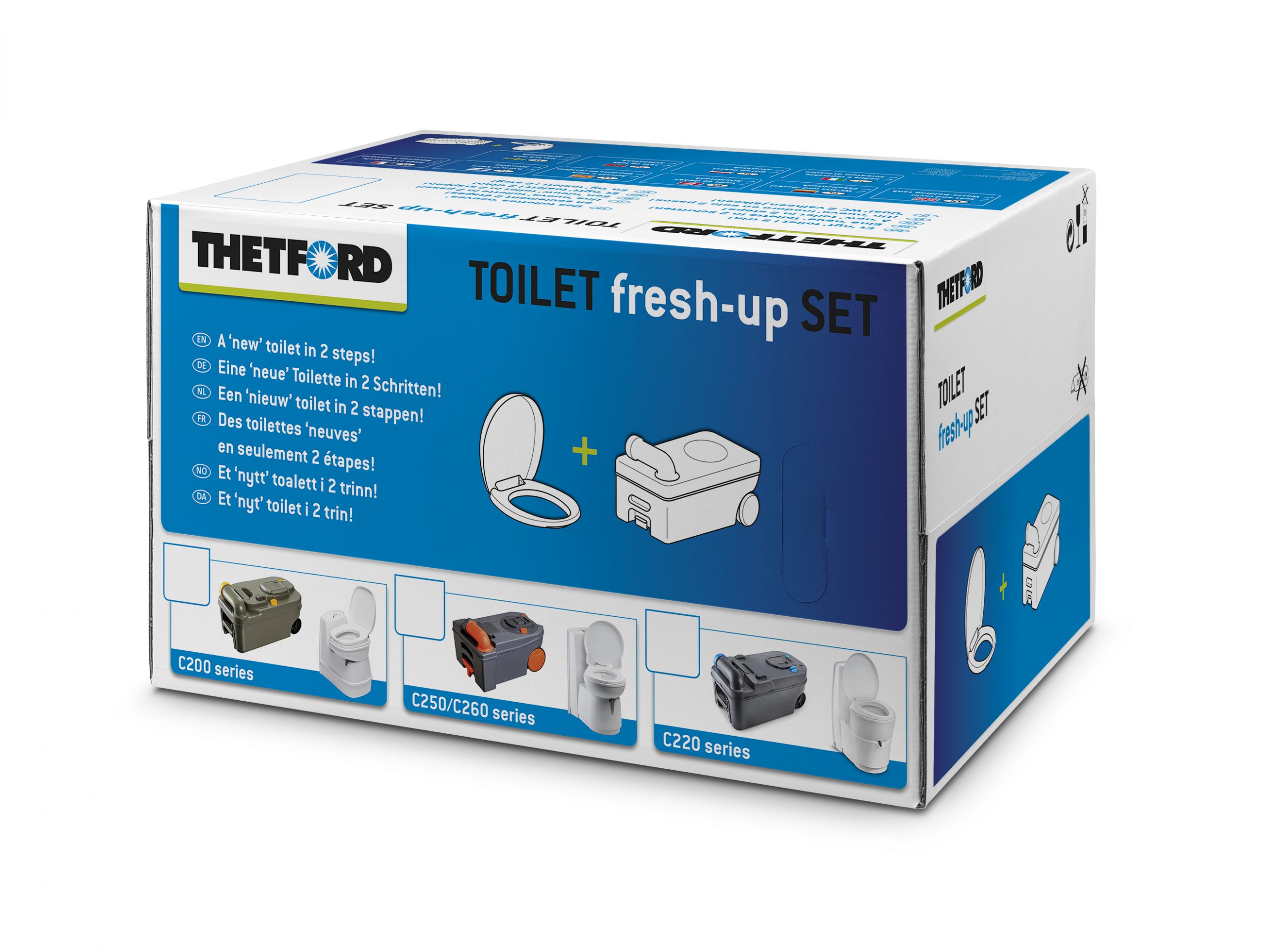 Il Fresh Up Set è un kit che fornisce una cassetta, un sedile e un copriwater nuovi per tutti i modelli di toilette Thetford, anche i più datati. Qualsiasi toilette Thetford, può, con grandissima semplicità di installazione, tornare come nuova grazie al suo specifico Fresh Up Set.