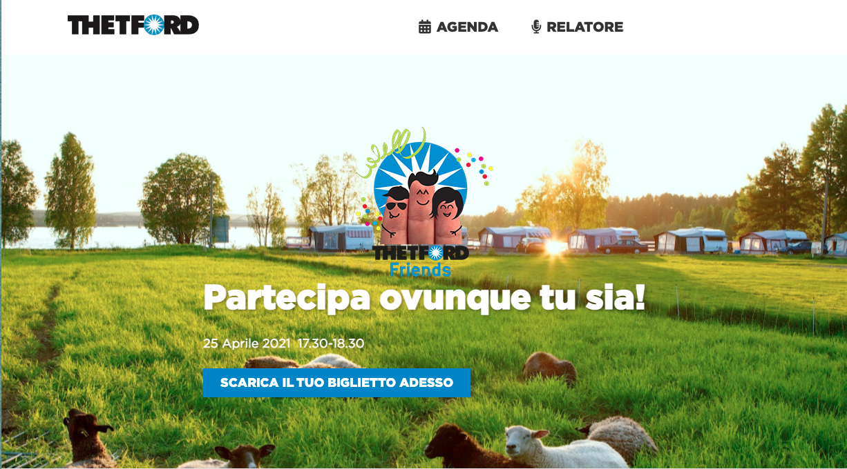 Collegandosi alla pagina Facebook Thetford Italy (https://www.facebook.com/Thetford-Italy-104298635065645), inoltre, è già possibile scaricare il biglietto elettronico del primo Evento Thetford Friends Online, un evento europeo con sottotitoli in 7 lingue, tra cui l’Italiano, che si terrà domenica 25 aprile 2021, dalle 17.30 alle 18.30. Nel corso dell’evento si parlerà della situazione attuale del settore, si avrà l’opportunità di fare un tour virtuale della fabbrica Thetford, si riceveranno consigli utili sull’utilizzo dei prodotti e si avrà la possibilità di vincere due Fresh-up Set per Paese. Lo staff Thetford al completo, capitanato dal Marketing Manager per l’Europa, Norbert van Noesel, sarà a disposizione dei partecipanti e potrà anche rispondere live alle domande poste nel corso dell’evento.