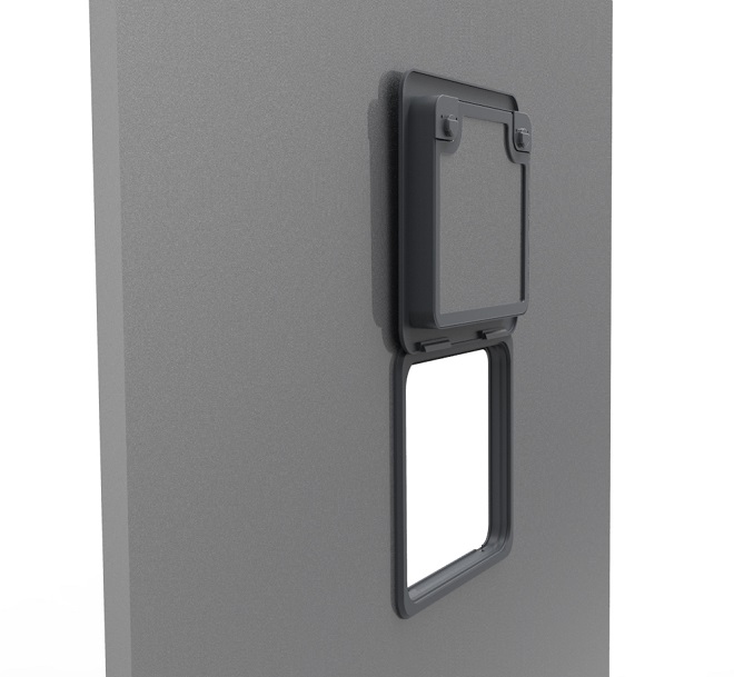 Lo sportellino di servizio con inserto magnetico è ora disponibile anche in un nuovo colore grigio scuro che si abbina perfettamente con il colore della plastica dei fascioni laterali del Fiat Ducato.