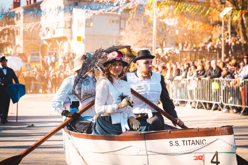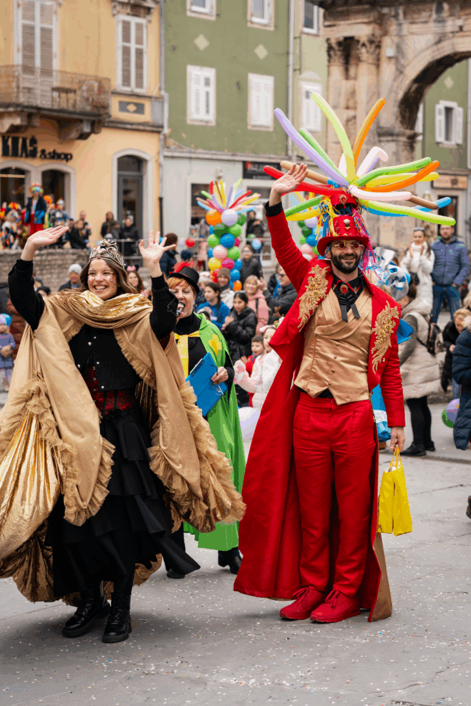 A Pola, il Carnevale si esprime in una dimensione urbana, dove il centro storico e i quartieri diventano palcoscenici di una festa collettiva. Dopo l’avvio simbolico del periodo carnevalesco, il cuore delle celebrazioni è rappresentato dalla grande sfilata dei gruppi mascherati, in programma il 7 febbraio. Il corteo attraversa la città partendo dall’Arena romana – uno dei monumenti più riconoscibili dell’Istria – per poi proseguire verso la Porta Aurea (Arco dei Sergi), tra carri allegorici, costumi satirici e musica. Il Carnevale di Pola continua l’8 febbraio, quando le maschere raggiungono i quartieri di Valmade e Montegrande, rafforzando il legame tra festa e comunità locale. La conclusione arriva il 17 febbraio, con uno dei riti più significativi del Carnevale istriano: il processo e il rogo del Pust, il fantoccio che incarna simbolicamente tutte le difficoltà e le sventure dell’anno appena trascorso. Con la sua distruzione rituale, la città saluta il Carnevale e si prepara all’inizio della Quaresima.
