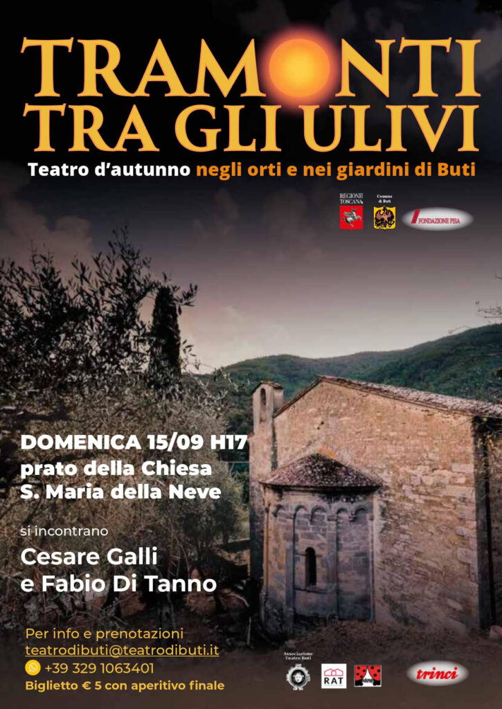 Le tre domeniche di settembre 15, 22 e 29 saranno i giorni in cui Associazione Teatro Buti Residenza Artistica della Toscana, presenta “Tramonti tra gli ulivi”. Sperimentati felicemente nell’autunno 2023, questi appuntamenti en plein air coniugano teatro e musica che vanno armoniosamente a collocarsi in angoli verdi della vallata di Buti (PI). Una sorta di overture all’anno culturale e artistico che sta per arrivare, un delicato avvio di tutte le attività del teatro di Buti, un invito rivolto al pubblico per offrire sia l’arte, ma anche la bellezza del territorio e la generosa ospitalità di una comunità.