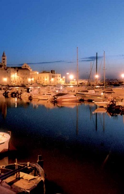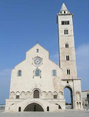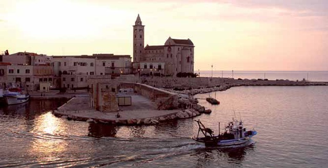 Le acque tranquille e protette dai Moli di Santa Lucia e Sant’Antonio con il suo instancabile faro sono cariche di storia, ma sono restie a raccontare come silenziosi sono i pescherecci e le navi da diporto ordinatamente ormeggiati: la darsena ben attrezzata dimostra la volontà della città di sviluppare una vocazione turistica non improvvisata, ma con solide radici nel passato. La città è, infatti, ricca di testimonianze artistiche e non ci si può esimere dall’ammirare la grandiosa e singolare Cattedrale – definita per la sua nobile maestosità Regina delle Cattedrali pugliesi – contornata dal mare e costruita dal 1099 (anno della canonizzazione di San Nicola Pellegrino) al 1143 con la famosa Pietra di Trani, tufo calcareo rosa chiaro tendente al bianco.