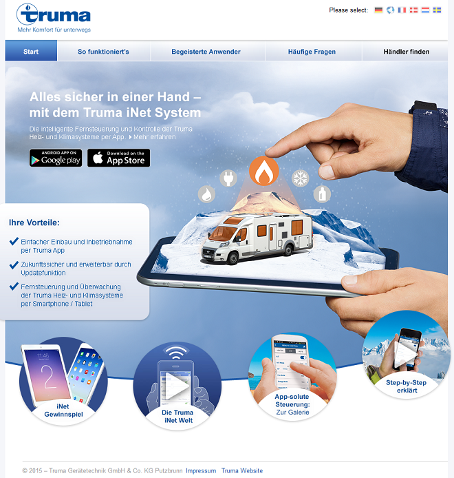 In questo mondo 3D i visitatori possono toccare con mano e cogliere l’utilità e il funzionamento dell’iNet System – un’esperienza con effetto “wow” garantito! Tutti i visitatori che scaricheranno l’App di Truma con la nuova funzione “telecomando” direttamente sul posto allo stand di Truma, riceveranno un piccolo regalo.