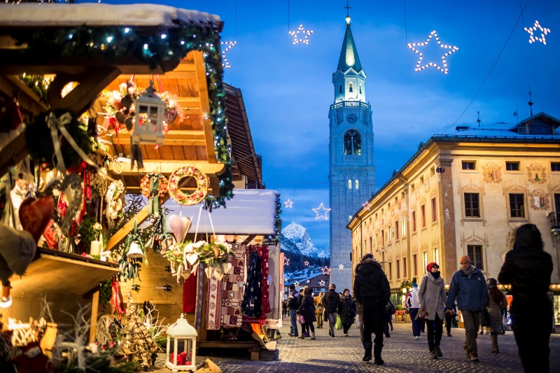 Per le spese di Natale, ci sono i mercatini in piazza – tra i più suggestivi c’è forse quello di Cortina d’Ampezzo, con le casette di legno distribuite lungo corso Italia e il calendario dell’Avvento in formato gigante alle finestre del Comun vecio, il palazzo storico dell’ex municipio, di fianco all’iconico campanile.