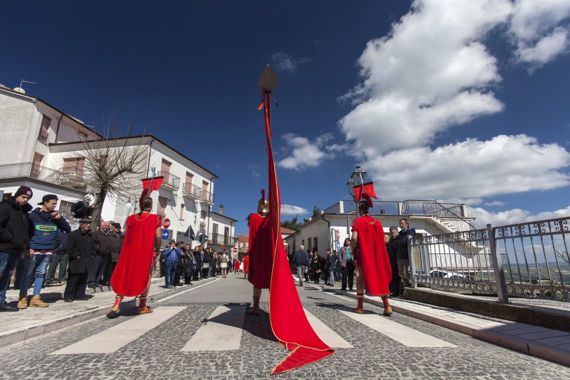 La tradizione vuole che i giovani si vestano da soldato romano in costume da littore o da centurione, come prova di iniziazione attraverso l’esibizione fisica, sfidando i rigori di una primavera che quasi sempre tarda a venire in un paese di 870 m/slm, indossando una corazza e sfilando tra la folla, che assiste al lento dipanarsi della rappresentazione religiosa, per denunciare la propria esistenza alla comunità. Oltre ai simboli del potere romano (dall’ Aquila latina con due alabardieri alla Grande Guida, da Cesare Imperatore con Lictores a Pilato), sfilano i cosiddetti “Misteri”, oggetti simbolo esibiti dagli incappucciati, e tele settecentesche, di antica fattura, rappresentanti le scene della vita e della morte di Cristo, con frasi del racconto evangelico di San Giovanni.